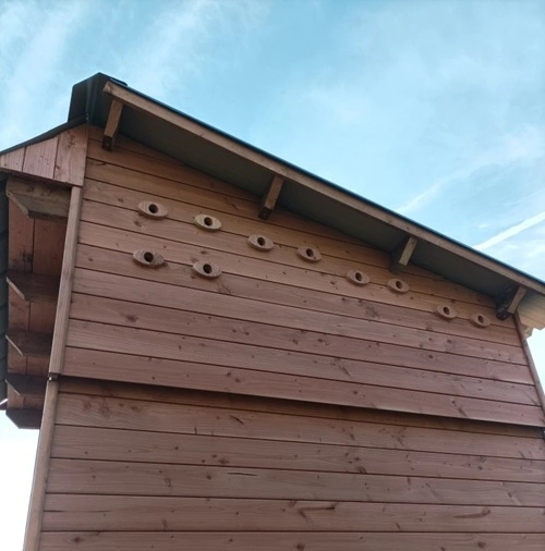 Petit bâtiment d’accueil de la biodiversité, ce gite multi-espèces a été conçu pour répondre aux exigences d’installation de nombreux animaux : hauteur de nidification, orientation, dimension et hauteur des trous d’envol, luminosité, abris des vents dominants, température, exposition…